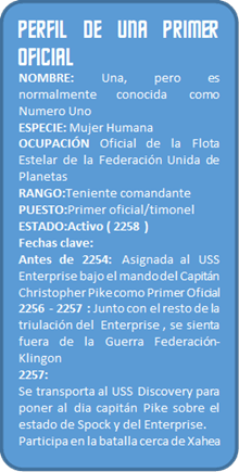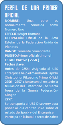 En 2254, una mujer humanoide sirve como primer oficial a bordo del U.S.S. Enterprise NCC-1701, bajo el mando del capitán Christopher Pike. Numero Uno tiene el rango de teniente, pero, según Pike, es la oficial más experimentada a bordo de la nave en ese momento. Ella no es la única mujer en la Flota Estelar, pero una oficial que ocupa un puesto de alto rango a bordo de una nave estelar es bastante poco común en esta época.